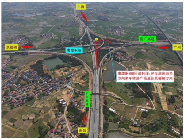 管制范圍滬昆高速南昌方向來車轉(zhuǎn)入濟(jì)廣高速景德鎮(zhèn)方向的車輛,禁止所有車輛通行
