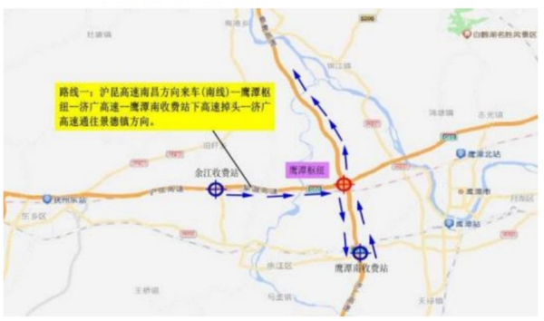 路線一:滬昆高速南昌方向來車(南線)--鷹潭樞紐一濟(jì)廣高速--鷹潭南收費(fèi)站下高速掉頭--濟(jì)廣高速通往景德鎮(zhèn)方向