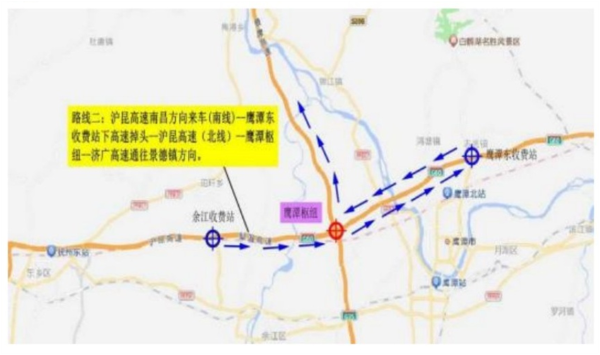 路線二:滬昆高速南昌方向來車(南線)--鷹潭東收費(fèi)站下高速掉頭--滬昆高速(北線)--鷹潭樞紐--濟(jì)廣高速通往景德鎮(zhèn)方向