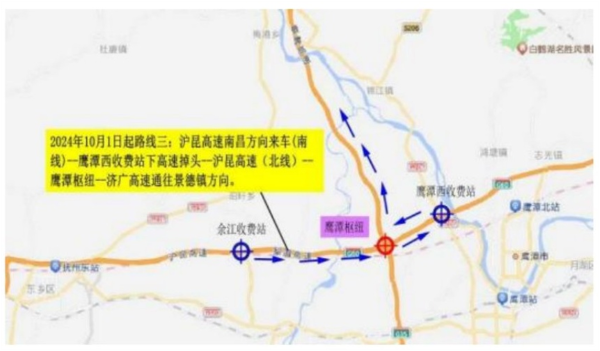 2024年10月1日起路線三:滬昆高速南昌方向來車(南線)--鷹潭西收費(fèi)站下高速掉頭--滬昆高速(北線)--鷹潭樞紐--濟(jì)廣高速通往景德鎮(zhèn)方向