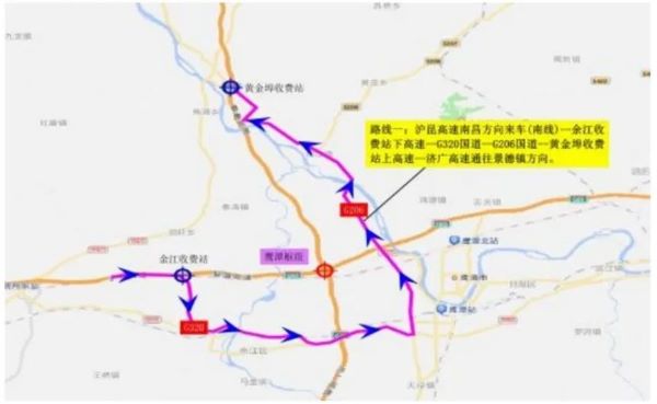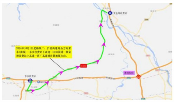 2024年10月1日起路線二:滬昆高速南昌方向來車(南線)--東鄉(xiāng)收費(fèi)站下高速--G236國(guó)道--黃金埠收費(fèi)站上高速--濟(jì)廣高速通往景德鎮(zhèn)方向