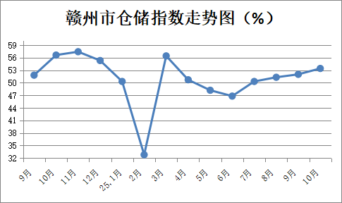 10月份,倉儲指數較上月上升1.4個百分點,呈上升趨勢。反映出市場受電商促銷提前備貨及傳統旺季因素提振,倉儲業務市場需求旺盛,結合贛州本地產品的特色,大量應季農產品流入市場,倉儲需求明顯提升,帶動倉儲行業市場需求高漲。