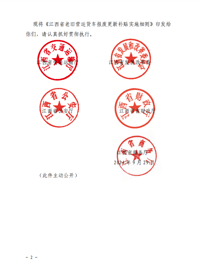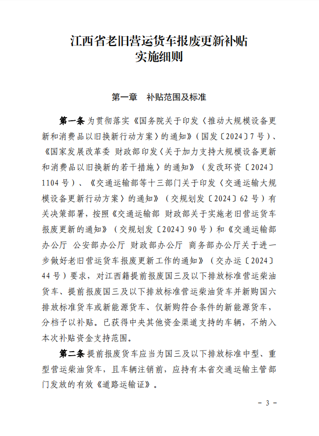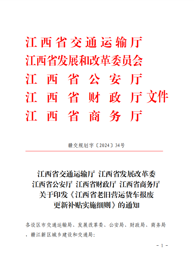 江西省印發《江西省老舊營運貨車報廢更新補貼實施細則》的通知