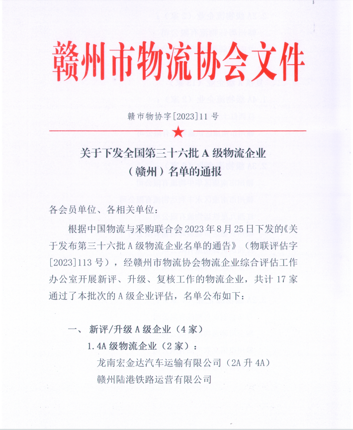 關(guān)于下發(fā)全國(guó)第三十六批A級(jí)物流企業(yè)(贛州)名單的通報(bào)
