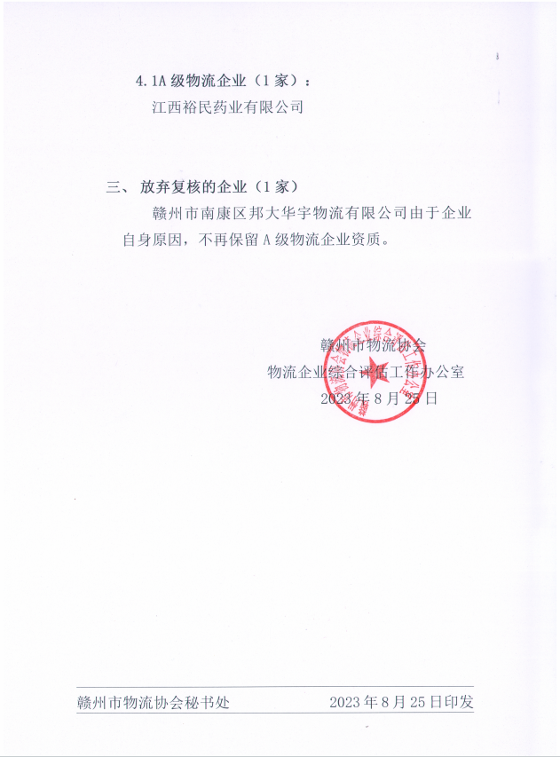 贛州市南康區(qū)邦大華宇物流有限公司由于企業(yè)自身原因,不再保留A級(jí)物流企業(yè)資質(zhì)。